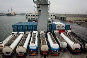 LKWs auf der Ladeluke werden vertäut