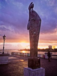 Ein Standbild einer Fischersfrau von Antwerpen, die den Fluss hinunterschaut