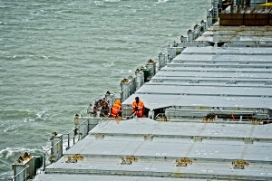 Zwei Männer der Mannschaft rollen die Lotsenleiter wieder auf.