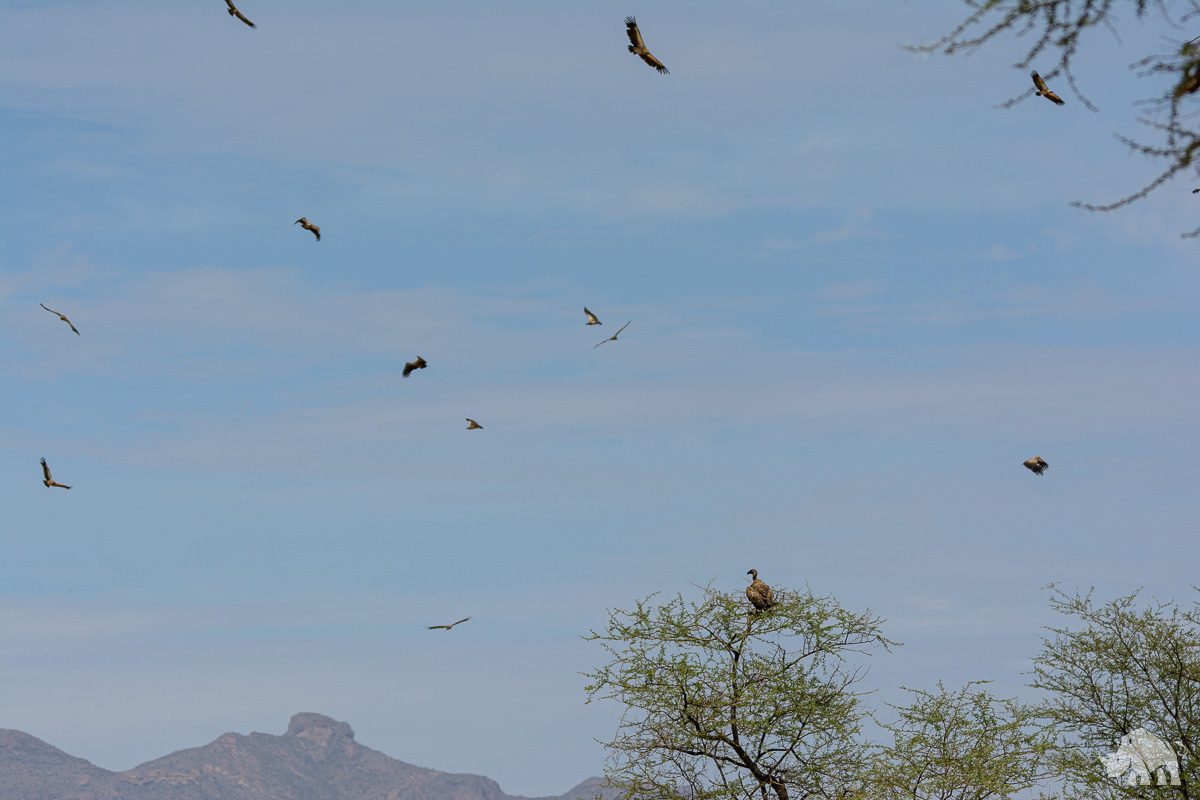 Weißrückengeier kreisen am Himmel