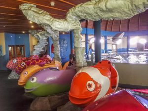 Im obersten Stockwerk ist ein Kinderspielplatz. Außerdem kann man auch von oben ins Becken schauen.