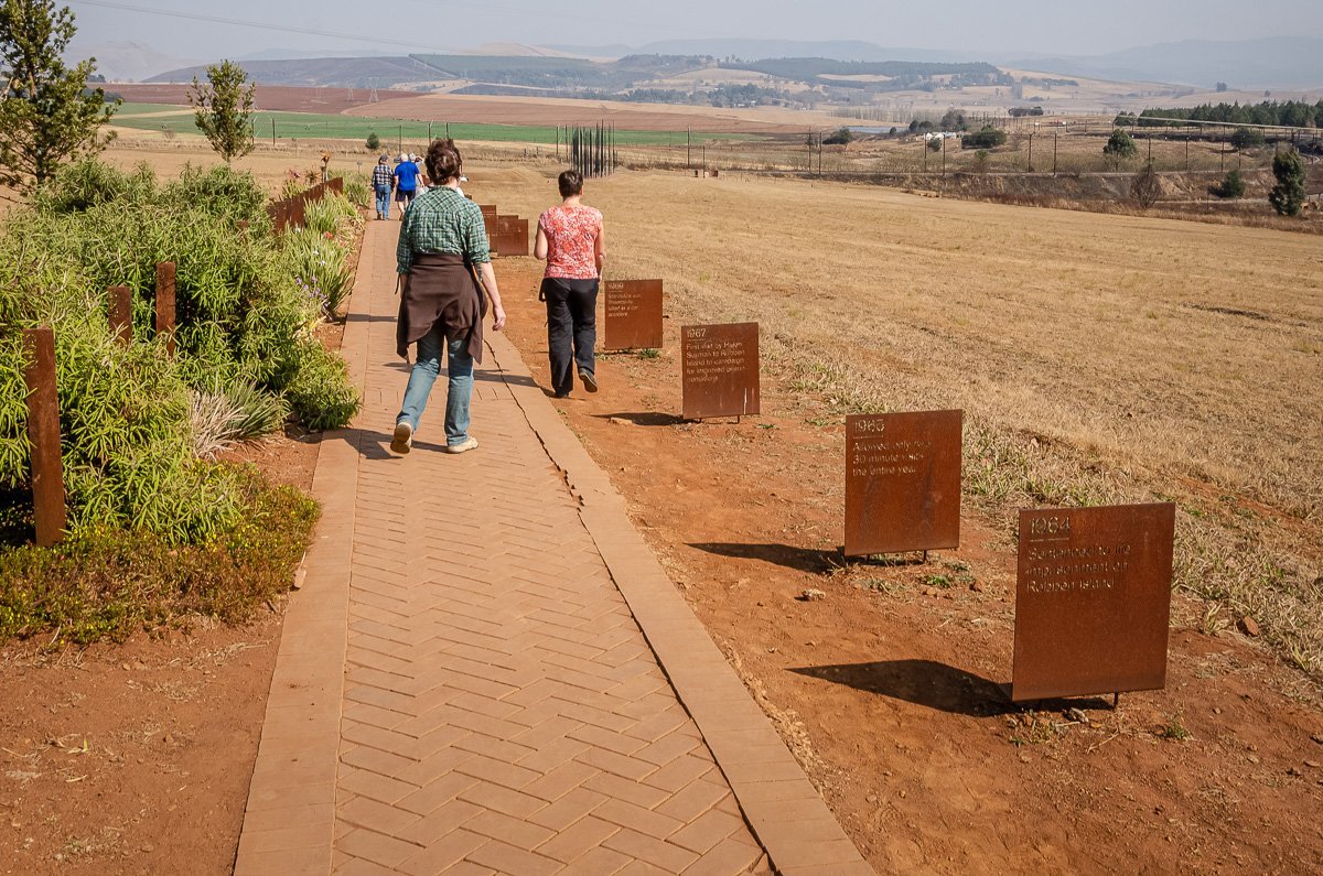 Auf dem Weg zur Skulptur informieren Wegweiser über das Leben des Nelson Mandela