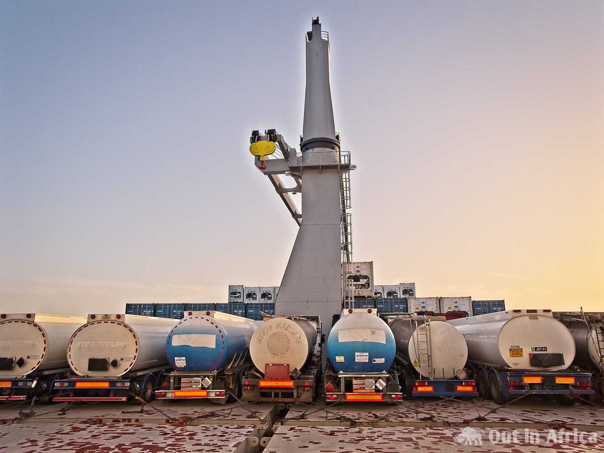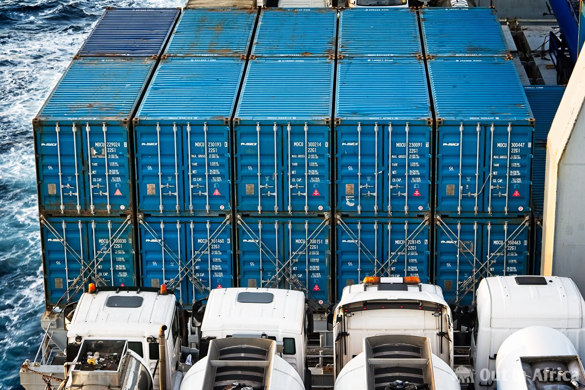 Auf dem Deck des Schiffes sind Container und LKWs geladen