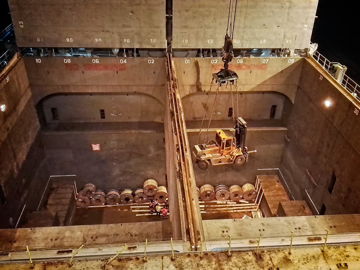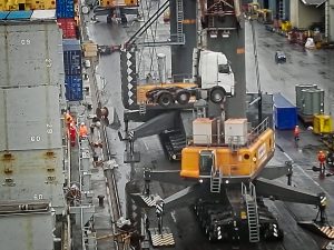 Um die riesigen Kabelrollen besser verstauen zu können, wird ein Gabelstabler in den Frachtraum gelassen
