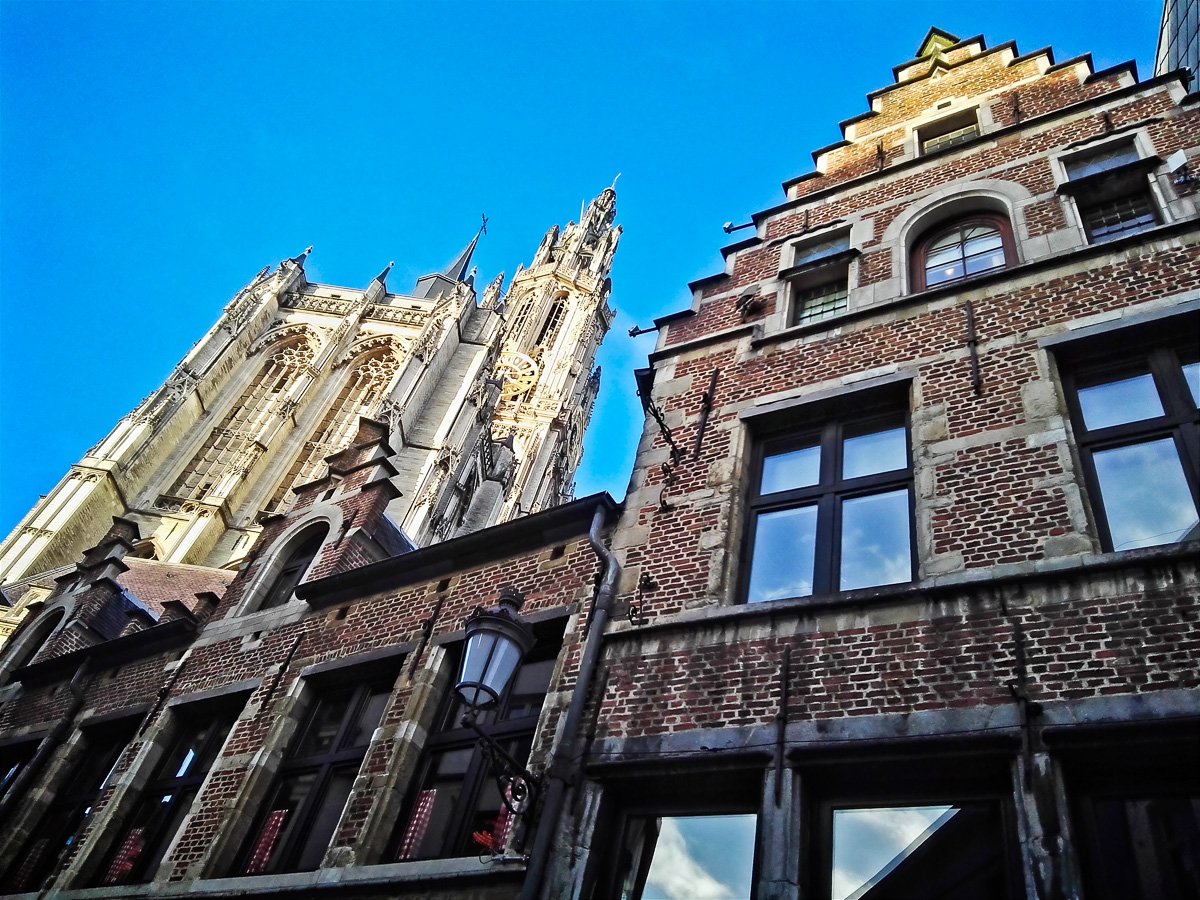 Die Antwerpender Kathedrale erhebt sich über die alten Häuser im flämischen Stil