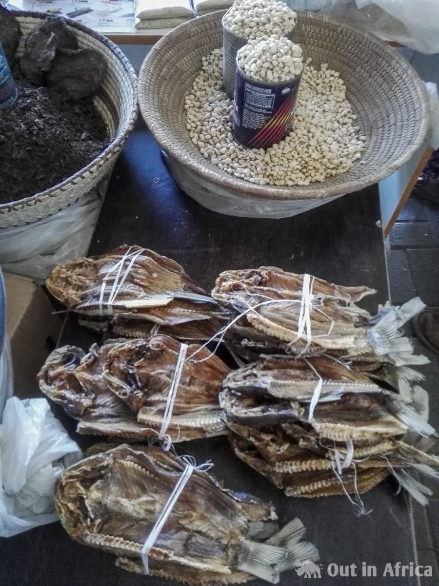 Traditionelle afrikanische Lebensmittel sind getrocknete Fische, wilder Spinat und weiße Bohnen