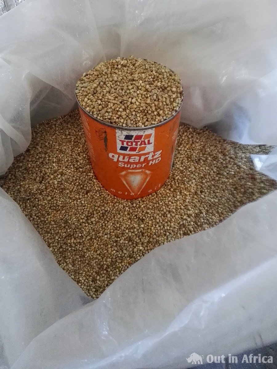 Hirse oder Mahangu. Aus diesen Körnern wird der traditionelle Brei der Ovambo hergestellt. Wie fast alle losen Lebensmittel wird sie pro Dose verkauft.