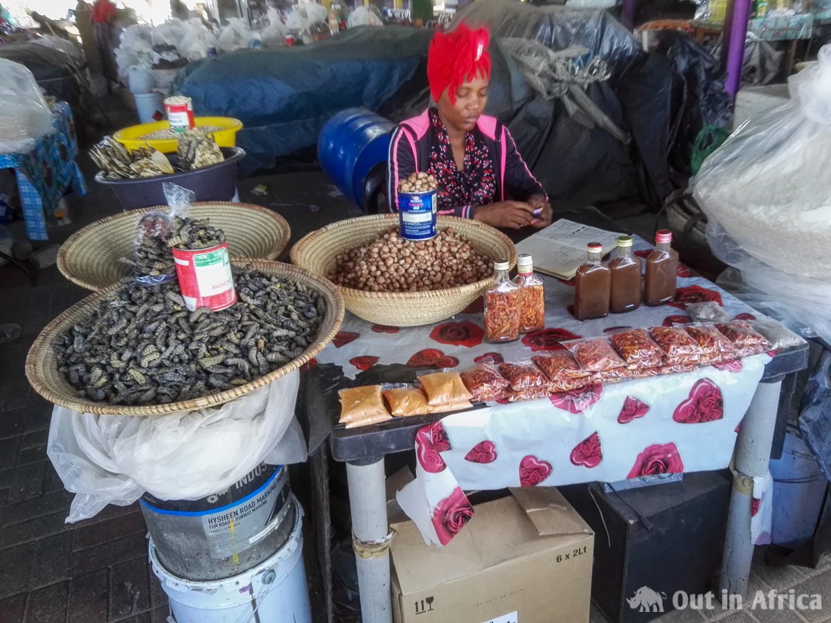 Neben den obligatorischen Mopanewürmern verkaufte diese Frau dicke braune Bohnen, Gewürze und Marulaöl