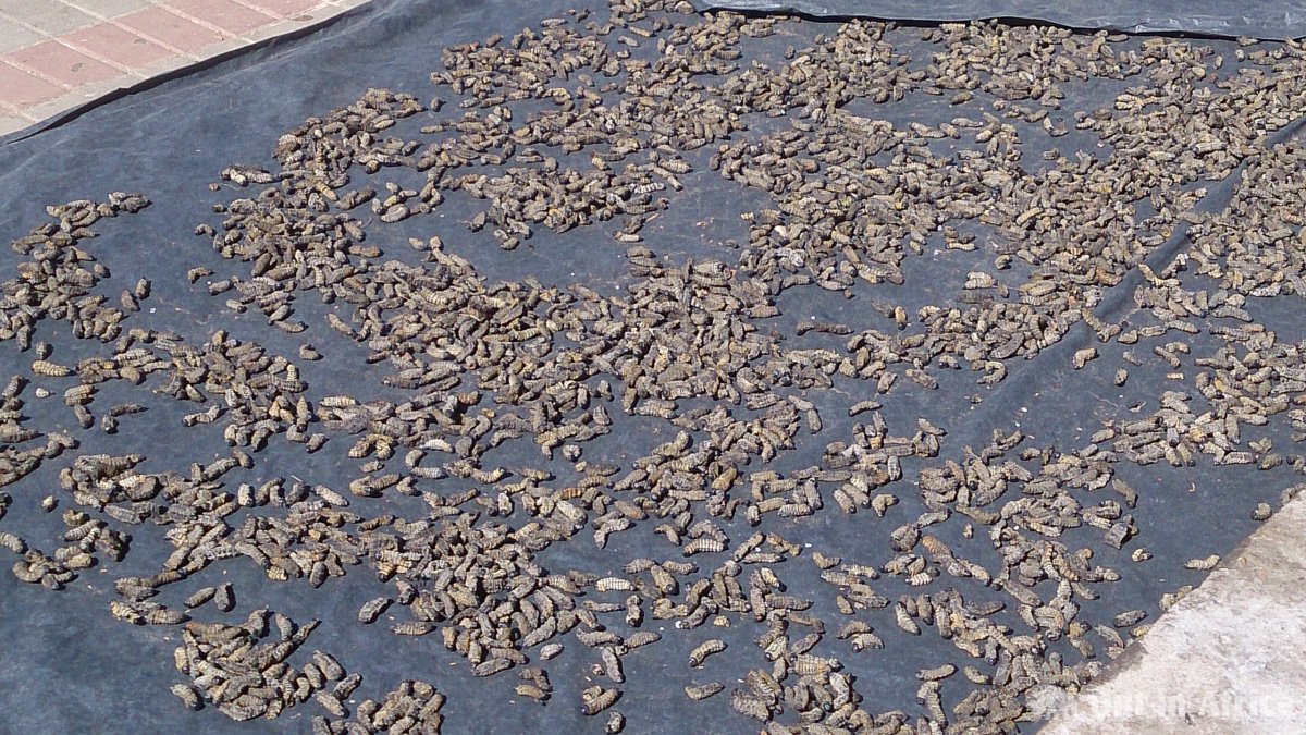 Draußen, in der Sonne, wurden die Mopanewürmer getrocknet
